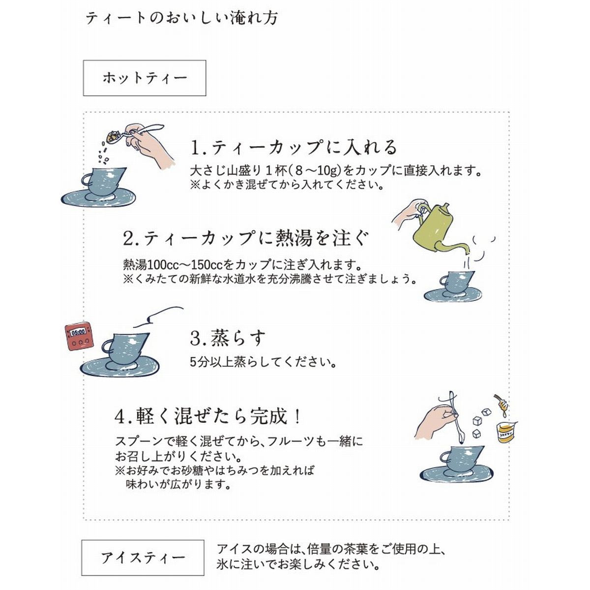 大さじ山盛り1杯カップに直接入れ熱湯を注ぎ、5分以上蒸らしてからお楽しみ下さい。